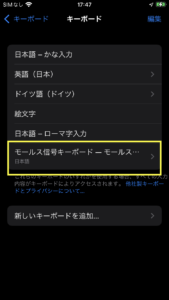 - 次に、iOS端末の[設定]アプリを起動し、[一般]→[キーボード]→[キーボード]→[モールス信号キーボード]をタップします。